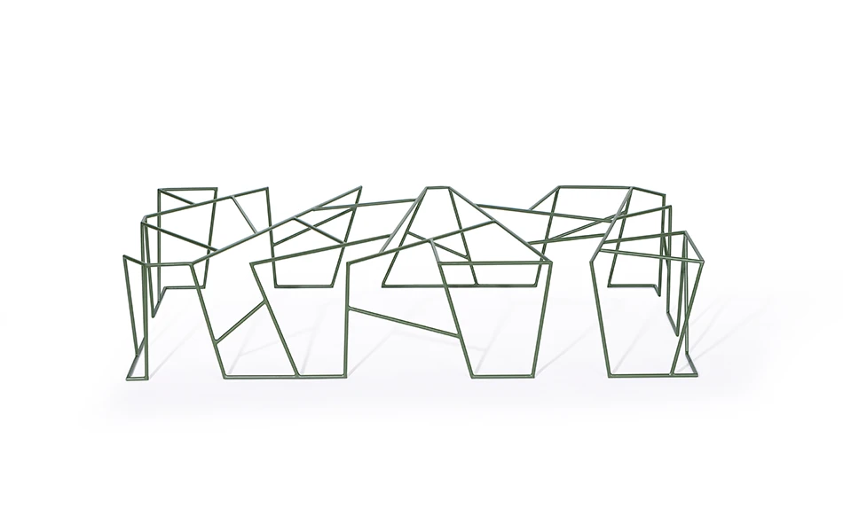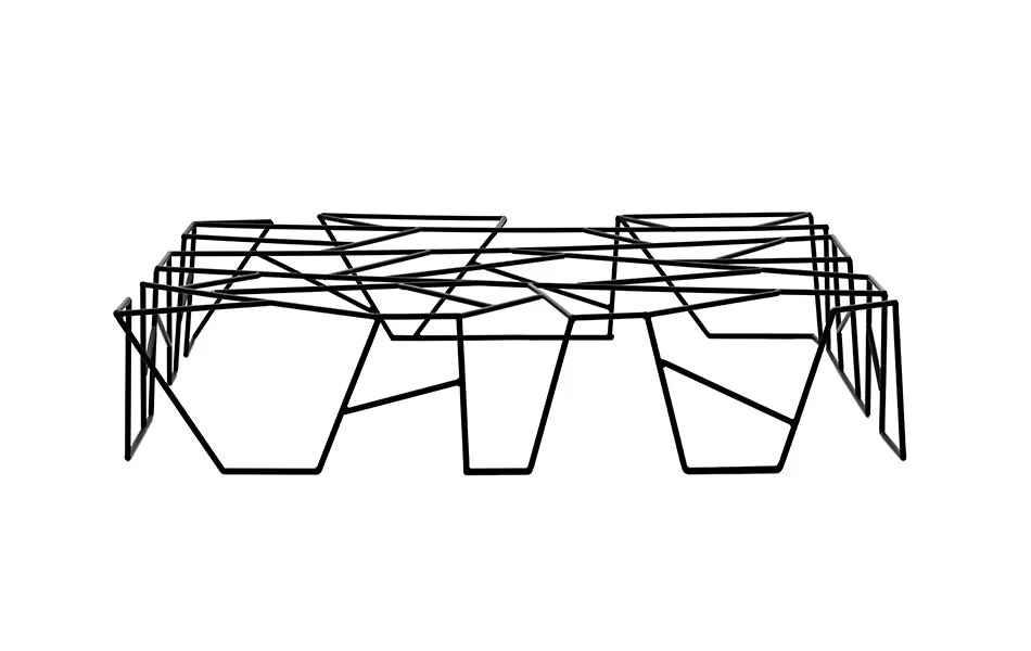 A mesa mais emblemática da marca. Seu desenho surgiu da leitura do livro – Arquitetura da felicidade do filósofo contemporâneo Alain de Botton, em um dos capítulos que ele fala sobre a organização estética do caos. Percebe-se que, mesmo com diversas hastes de metal soldadas em diferentes direções, fica visível uma linha imaginária do contorno